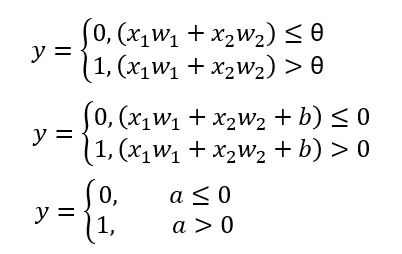 $$y= \begin{cases} 0 & \mbox(w_1x_1 + w_2x_2 \leq\theta) \\ 1 & \mbox(w_1x_1 + w_2x_2 \ge\theta) \end{cases}$$