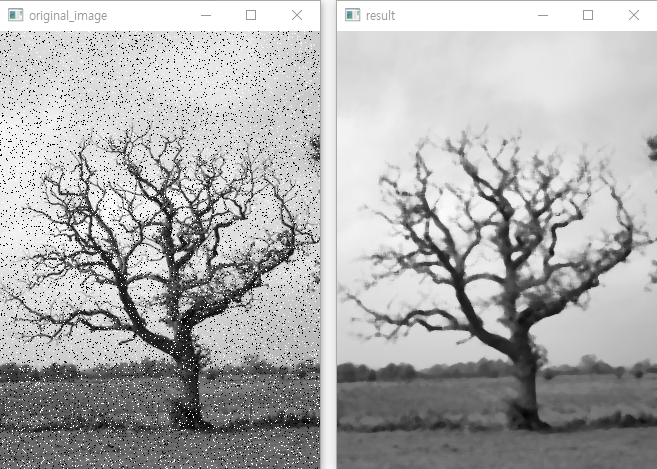 import cv2 original_image = cv2.imread('../data/salt_pepper.png', 0) result_image = cv2.medianBlur(original_image, 5) cv2.imshow('original_image', original_image) cv2.imshow('result', result_image) cv2.waitKey(0) cv2.destroyAllWindows()