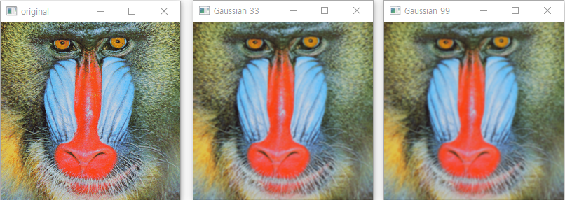 import cv2 org = cv2.imread('../data/mandrill.png', 1) averaged33 = cv2.GaussianBlur(org, (3,3), 1) averaged99 = cv2.GaussianBlur(org, (9,9), 1) cv2.imshow('original', org) cv2.imshow('Gaussian 33', averaged33) cv2.imshow('Gaussian 99', averaged99) cv2.waitKey(0) cv2.destroyAllWindows()