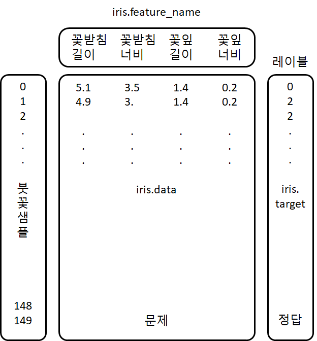>>> iris.data.shape (150, 4)iris.target은 정답 레이블이다. 0은 setosa, 1은 versicolor, 2는 virginica를 뜻한다.