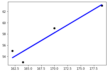 import matplotlib.pyplot as plt import numpy as np from sklearn import linear_model # scikit-learn 모듈을 가져온다 regr = linear_model.LinearRegression() X = [[164], [179], [162], [170]] # 선형회귀의 입력은 2차원으로 만들어야 함 y = [53, 63, 55, 59] # y = f(X)의 결과값 regr.fit(X, y) # 학습 데이터와 y 값을 산포도로 그린다. plt.scatter(X, y, color='black') # 학습 데이터를 입력으로 하여 예측값을 계산한다. y_pred = regr.predict(X) # 학습 데이터와 예측값으로 선그래프로 그린다. # 계산된 기울기와 y 절편을 가지는 직선이 그려진다 plt.plot(X, y_pred, color='blue', linewidth=3) plt.show()