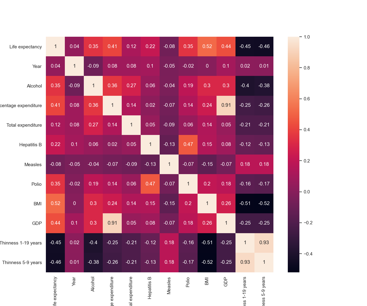 import matplotlib.pyplot as plt import pandas as pd import seaborn as sns life = pd.read_csv( 'https://raw.githubusercontent.com/dongupak/DataSciPy/master/data/csv/life_expectancy.csv' ) life = life[['Life expectancy', 'Year', 'Alcohol', 'Percentage expenditure', 'Total expenditure', 'Hepatitis B', 'Measles', 'Polio', 'BMI', 'GDP', 'Thinness 1-19 years', 'Thinness 5-9 years']] life.dropna(inplace=True) sns.set(rc={'figure.figsize': (12, 10)}) correlation_matrix = life.corr().round(2) sns.heatmap(data=correlation_matrix, annot=True) plt.show()