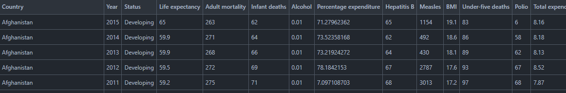 life_expectancy.csv 이 데이터는 WHO에서 내어 놓은 각 나라별 기대수명 데이터로 2010년부터 2015년까지 나라별 기대수명과 보건예산, 질병 통계, 비만도 등이 정리되어 있다.