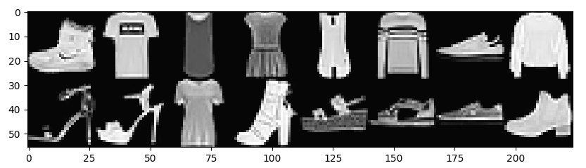 dataiter = iter(train_loader) images, labels = next(dataiter) img = utils.make_grid(images, padding=0) # 여러 이미지를 모아 하나의 이미지로 만듬 npimg = img.numpy() # matplotlib 호환을 위해 np로 변환 plt.figure(figsize=(10, 7)) plt.imshow(np.transpose(npimg, (1, 2, 0))) # 맷 플롯립이 인식하는 차원의 순서가 달라 0번째를 맨뒤로 plt.show()