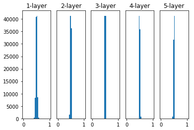 가중치를 평균이 0, 표준편차가 0.01인 정규분포로 초기화할 때의 각층의 활성화값 분포