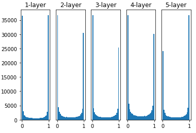 가중치를 평균이 0, 표준편차가 1인 정규분포로 초기화할 때의 각층의 활성화값 분포
